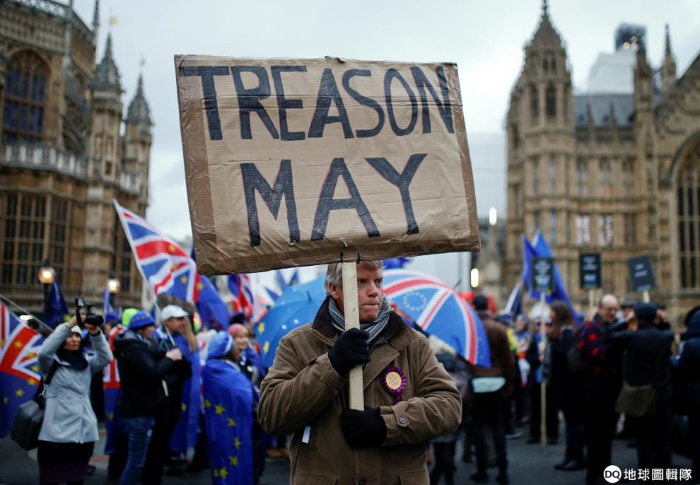 在國會大廈前,一名支持脫歐的示威者拿著「叛國梅伊」的標語表達不滿,與此同時,反對脫歐的民眾則在畫面後方示威。