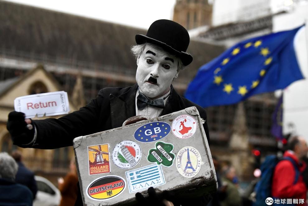一名反對脫歐的示威者打扮成默劇演員的模樣,提著皮箱表示自己想搭上「回到歐盟」的列車。