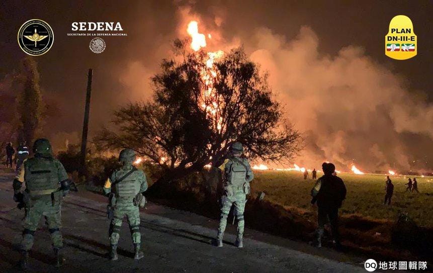上周五(18)在墨西哥中部希達哥州(Hidalgo)特拉威立潘市(Tlahuelilpan),歷經好幾周的燃油短缺後,有些市民聽說行經此地的油管恢復運作,立刻跑到現場鑽油管偷裝燃油,人群也隨著耳語逐漸聚集起來。雖然現場駐有 20多名士兵,但他們在數量上完全無法壓制住民眾,也只能口頭警告民眾不要再靠近。