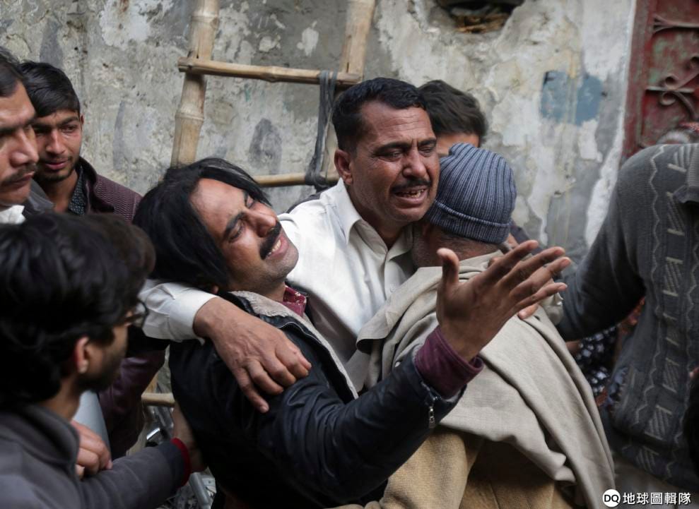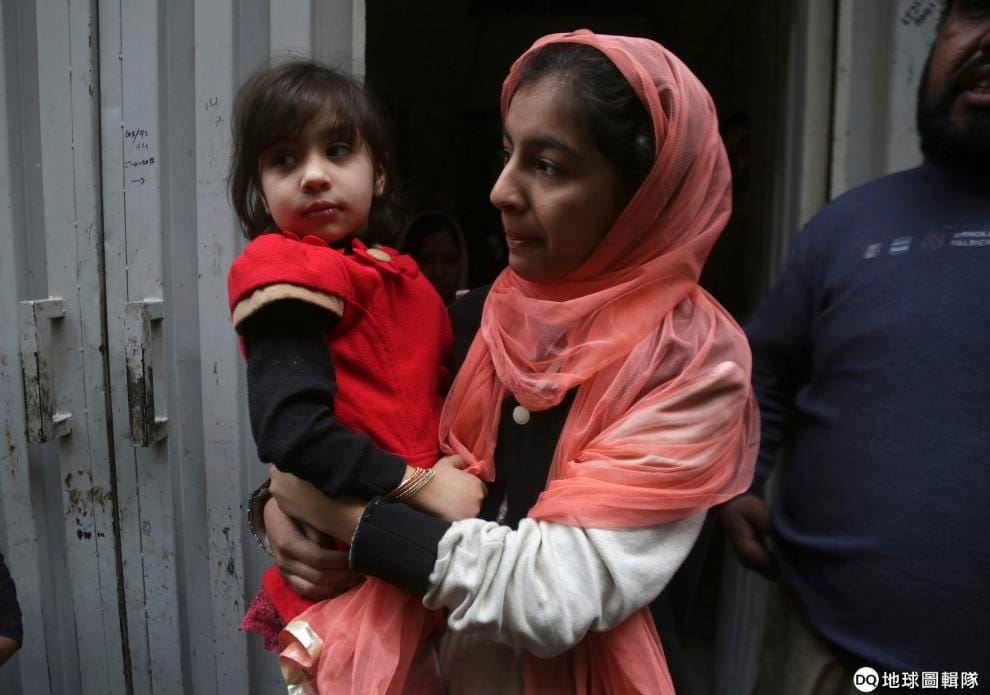 圖為 20號,在巴基斯坦第二大城拉合爾(Lahore),目睹這場槍擊案倖存下來的哈迪亞‧哈利勒,被一名親戚抱在懷裡。