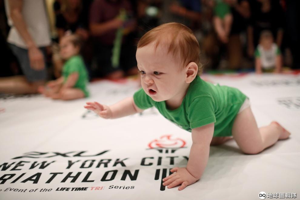 圖為 2017年7月,在美國紐約由尿布廠商「Diaper Derby」舉辦的年度寶寶爬行大賽,一名參賽者賣力地向前爬。