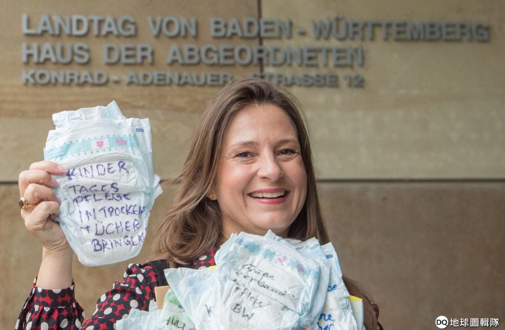 圖為 2016年11月,在德國巴登-符騰堡邦(Baden-Wuerttemberg)斯圖加特(Stuttgart),保母協會理事長梅克(Christina Metke)在議會前高舉一片尿布。