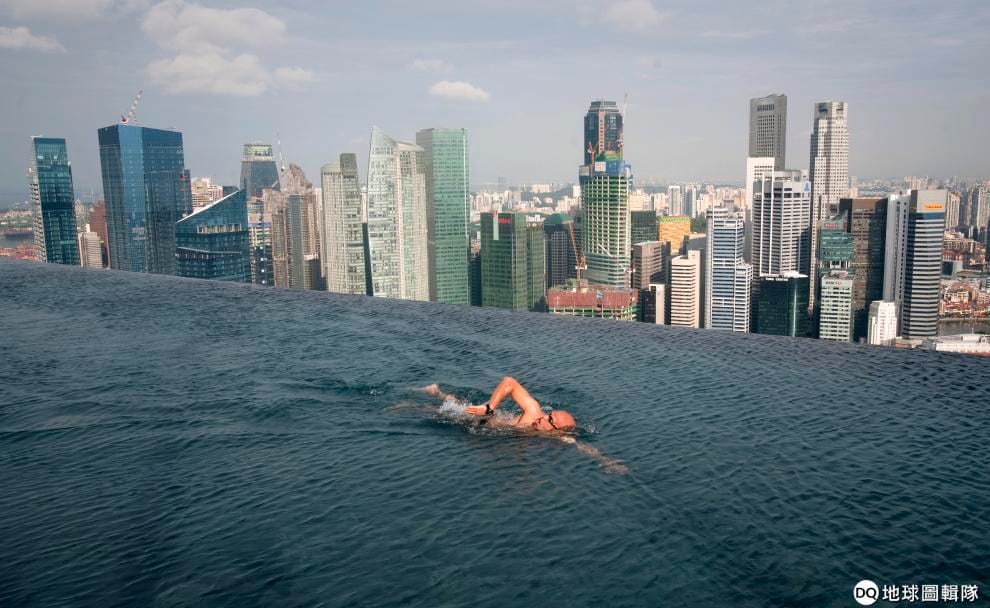 2010年6月,一名遊客正在新加坡濱海灣金沙酒店的頂樓游泳。