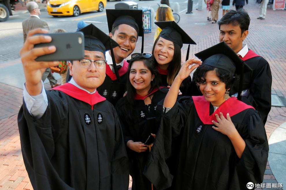 圖為 2016年5月,在美國哈佛大學第 365屆畢業典禮開始前,畢業生們開心地拿起手機自拍。