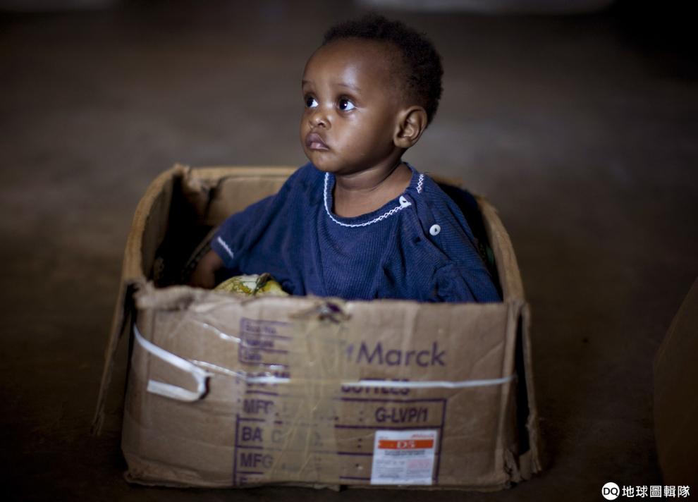 2009年2月在剛果布尼亞(Bunia)的Kizito孤兒院,一名在戰爭中失去雙親的孤兒坐在紙箱裡。