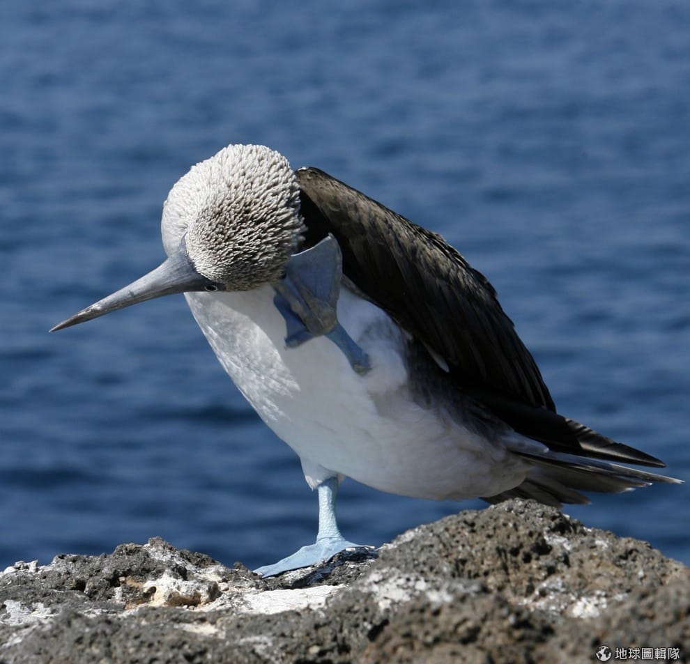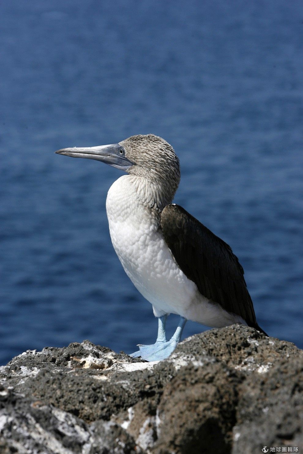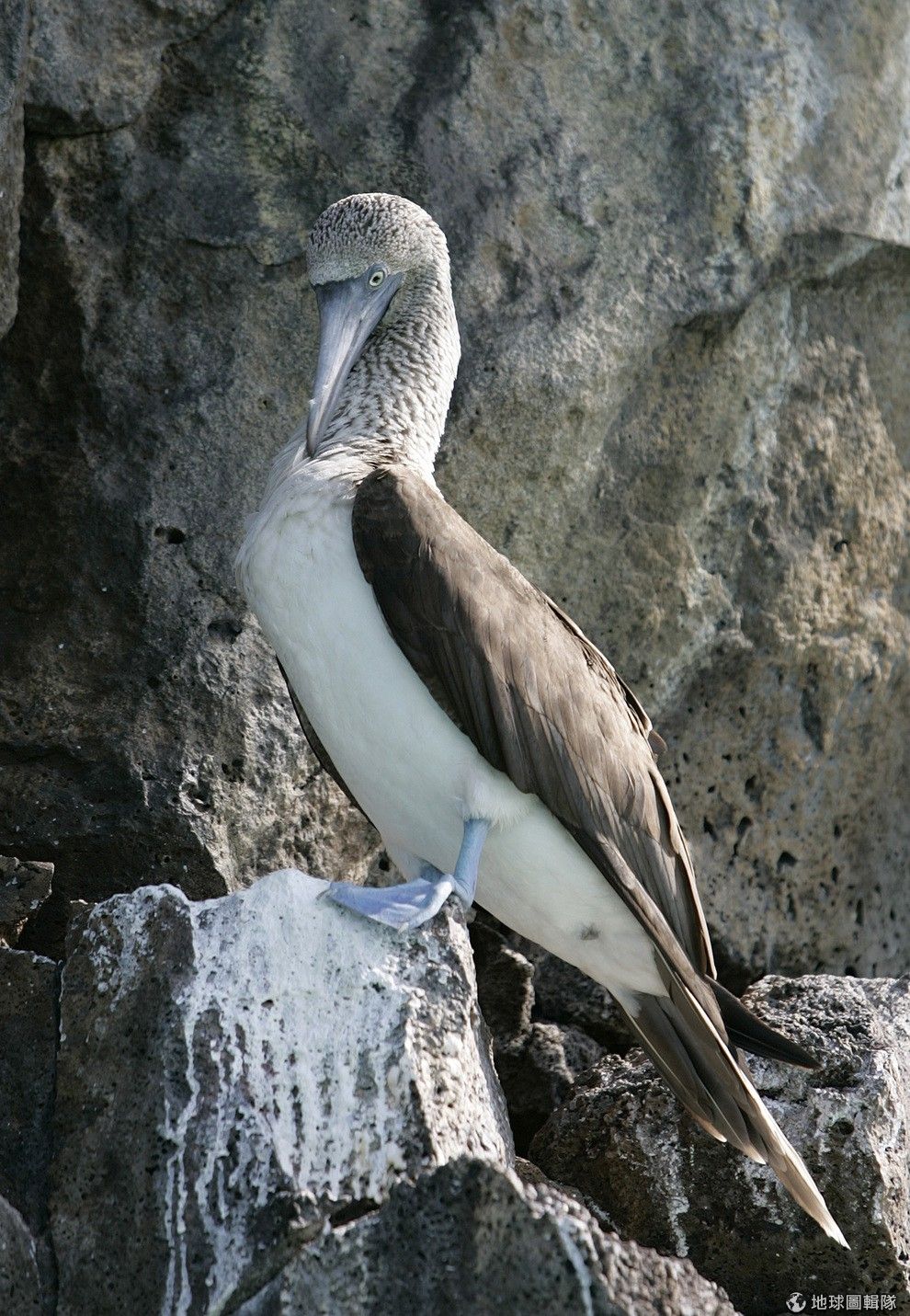 一隻藍腳鰹鳥在岩石上安靜休息。藍腳鰹鳥的腳呈淡藍綠色至深水藍色,雄鳥及雛鳥腳的顏色比較淺。