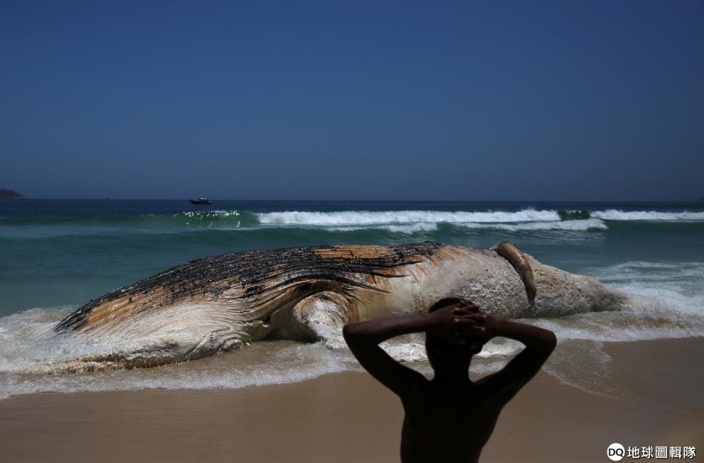 圖為 2017年11月,在巴西里約熱內盧(Rio de Janeiro),一隻鯨魚擱淺在伊帕內瑪沙灘(Ipanema beach)上。