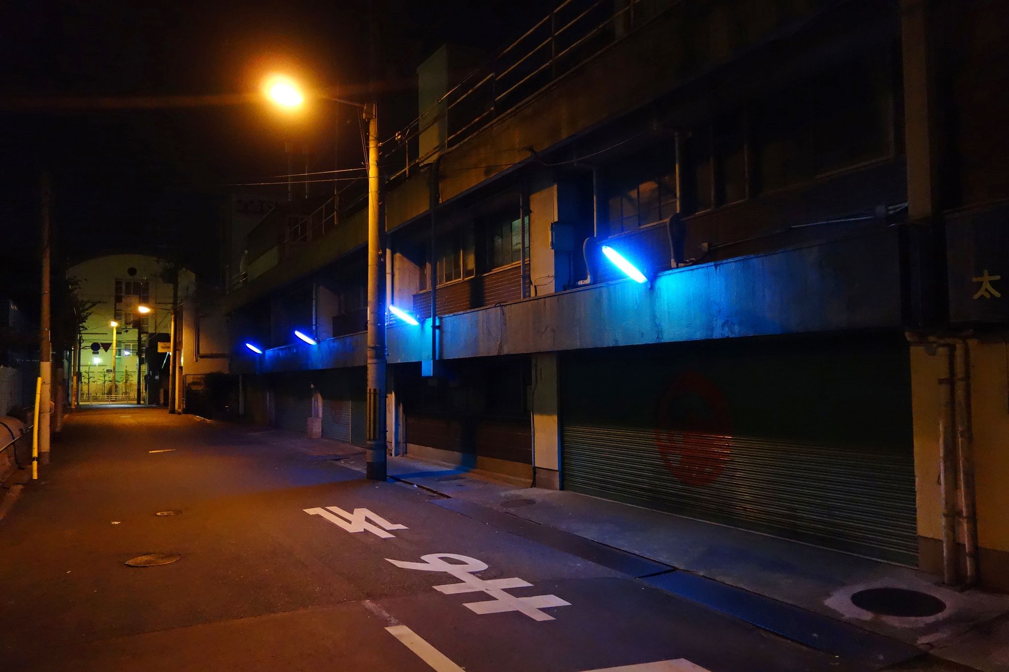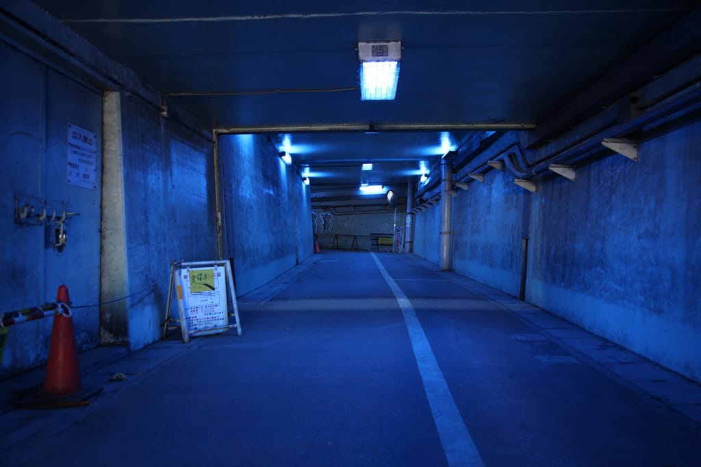 2009年2月,在東京西日暮里某處的隧道裡,所有的照明設備都是藍光。