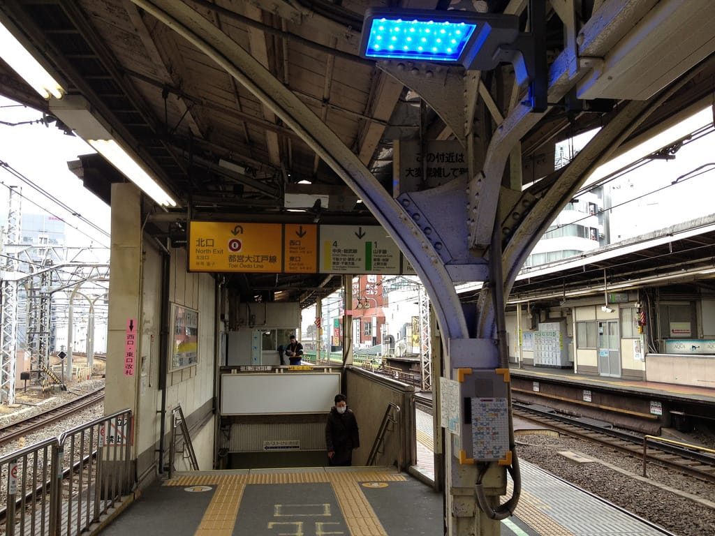 圖為 2009年9月,JR東日本宣布要在東京最繁忙的山手線沿線月台上,全面加裝藍光LED後,首波裝上藍光LED的月台景象。根據JR東日本的說法,他們在月台加裝藍光後真的讓跳軌自殺率下降了。