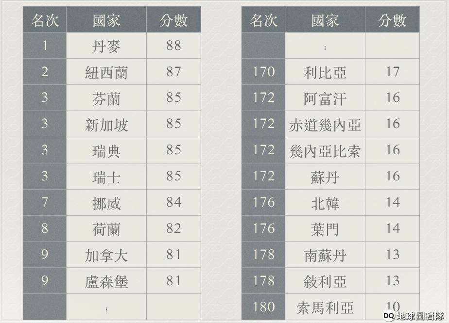 昨日(31),非政府組織國際透明組織(Transparency International, TI)公布了 2018年的清廉印象指數大調查(Transparency International Corruption Perceptions Index, CPI),在 180個國家中,丹麥和紐西蘭持續佔據排名中的前兩位,芬蘭、新加坡、瑞典、瑞士則以相同的分數位居第三,北韓、葉門、南蘇丹、敘利亞、索馬利亞則為倒數第五。台灣則在第 31名。