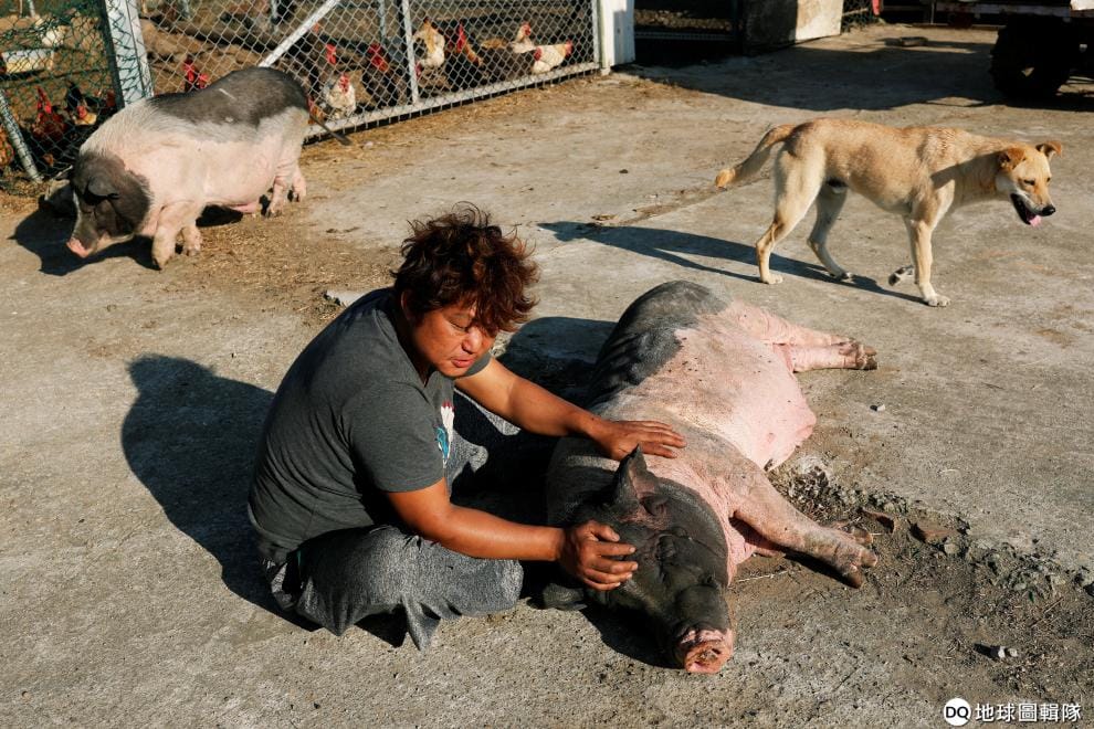在新北市經營流浪動物收容所的Luo Hong-Sian,正在幫一隻遭人棄養的寵物豬按摩。