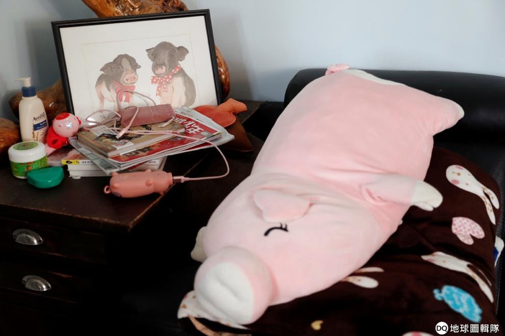 路透社 / 達志影像在Anita Chen的家中,擺著她兩隻寵物豬的合照,以及粉紅色的豬抱枕。