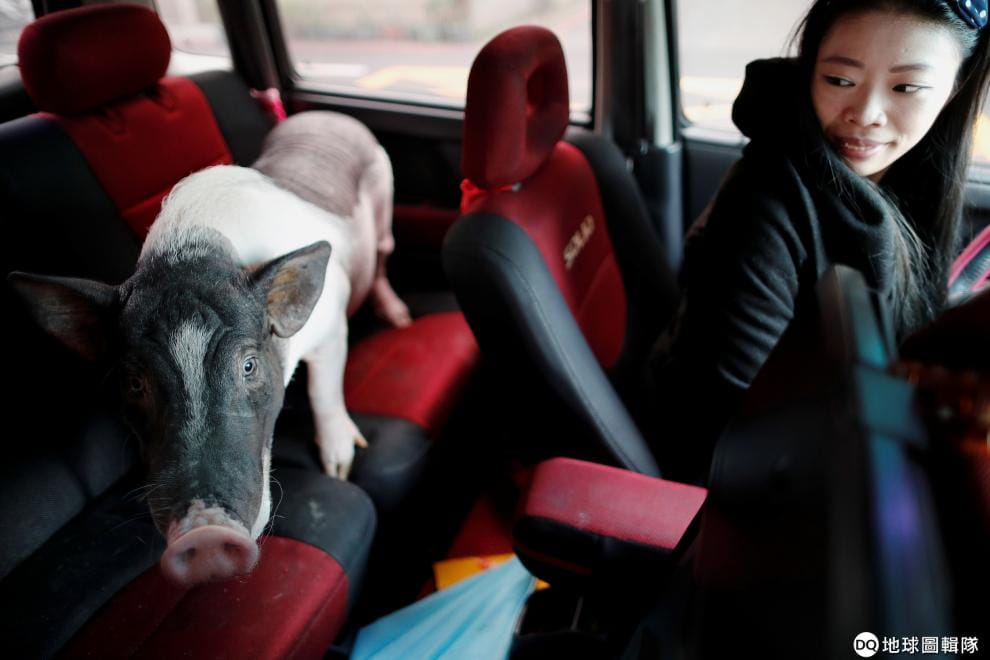路透社 / 達志影像做完檢查的寵物豬Ge Ge,開心地跳上後座跟著主人回家。