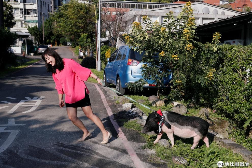 住在台北的寵物豬飼主Anita Chen,牽著今年五歲的寵物豬Mei-Mei散步。