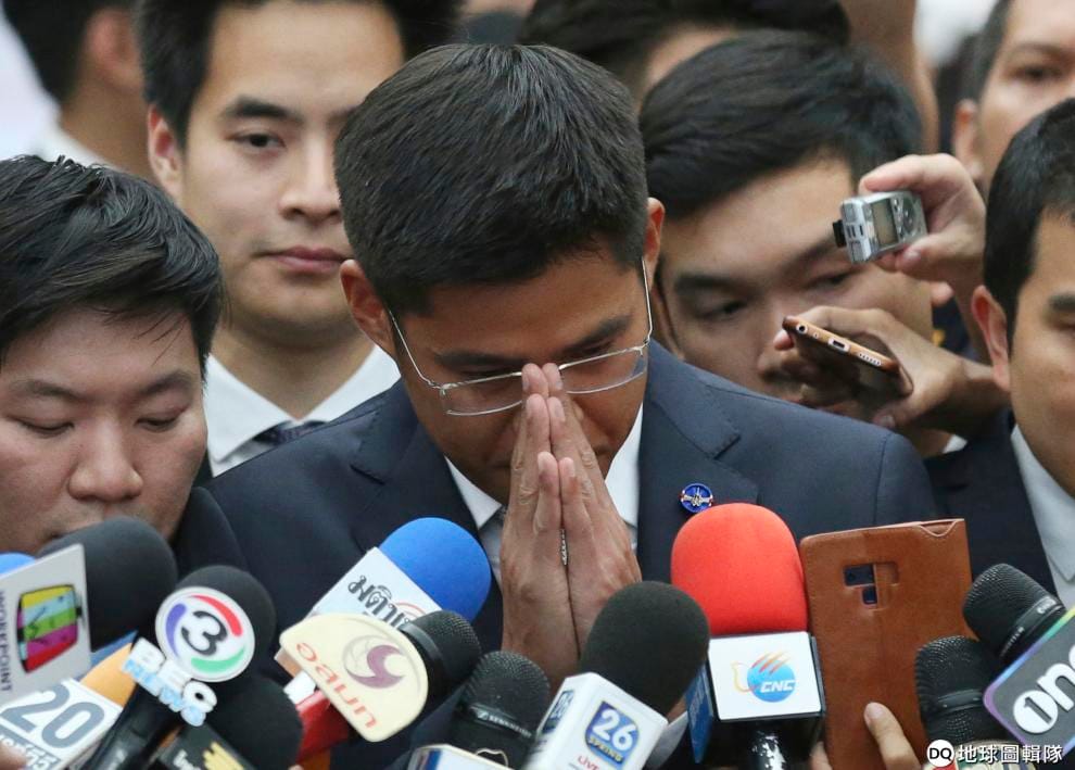 本月 7號,泰愛國黨黨魁伊布查普(Preechapol Pongpanich)在聽完憲法法庭宣判的結果後,正在接受記者訪問。(03/08新增)
