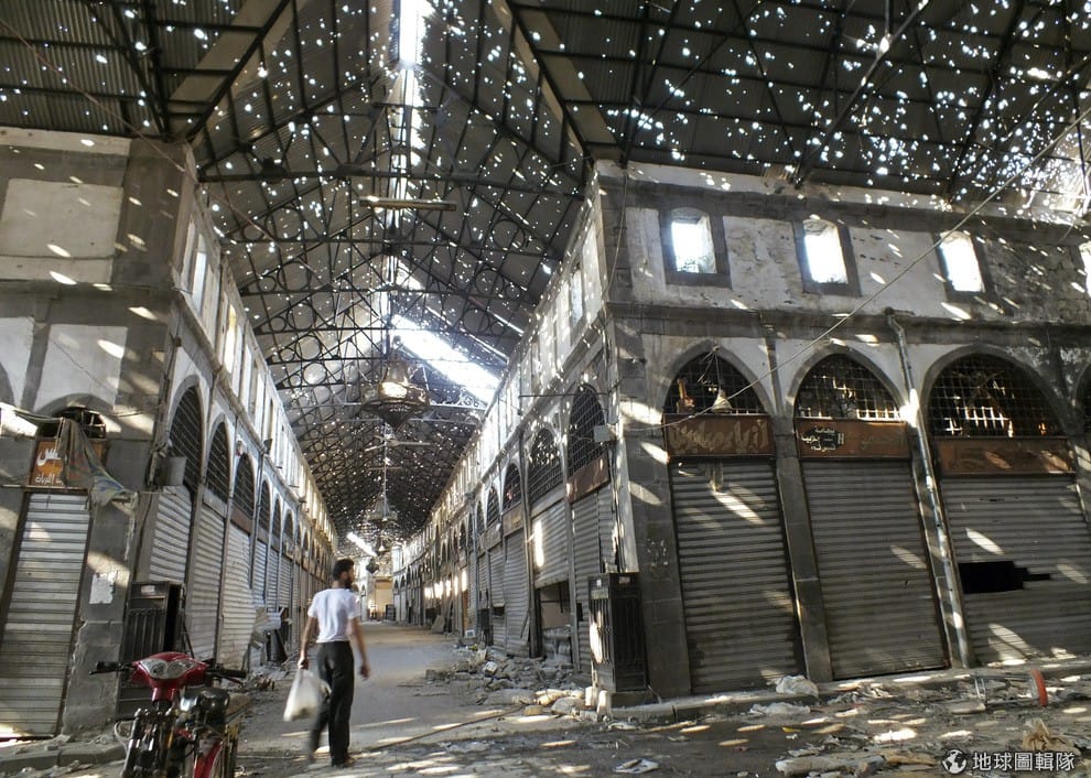 地球圖輯隊敘利亞當地一處遭到轟炸的老市集,男子從彈孔灑下的陽光中走過。