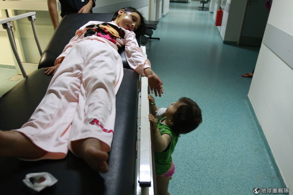 敘利亞的醫院內,6歲的瑪哈默看著病床上的姊姊
