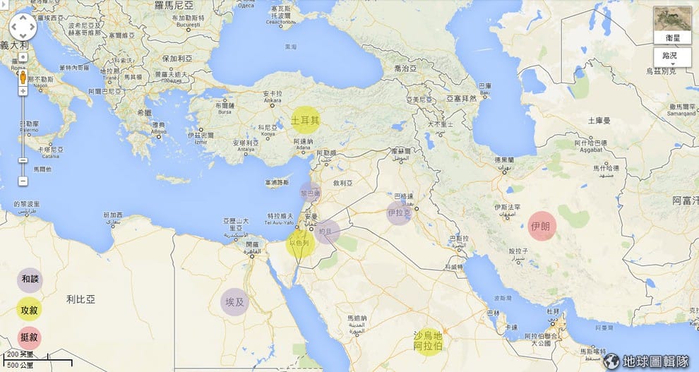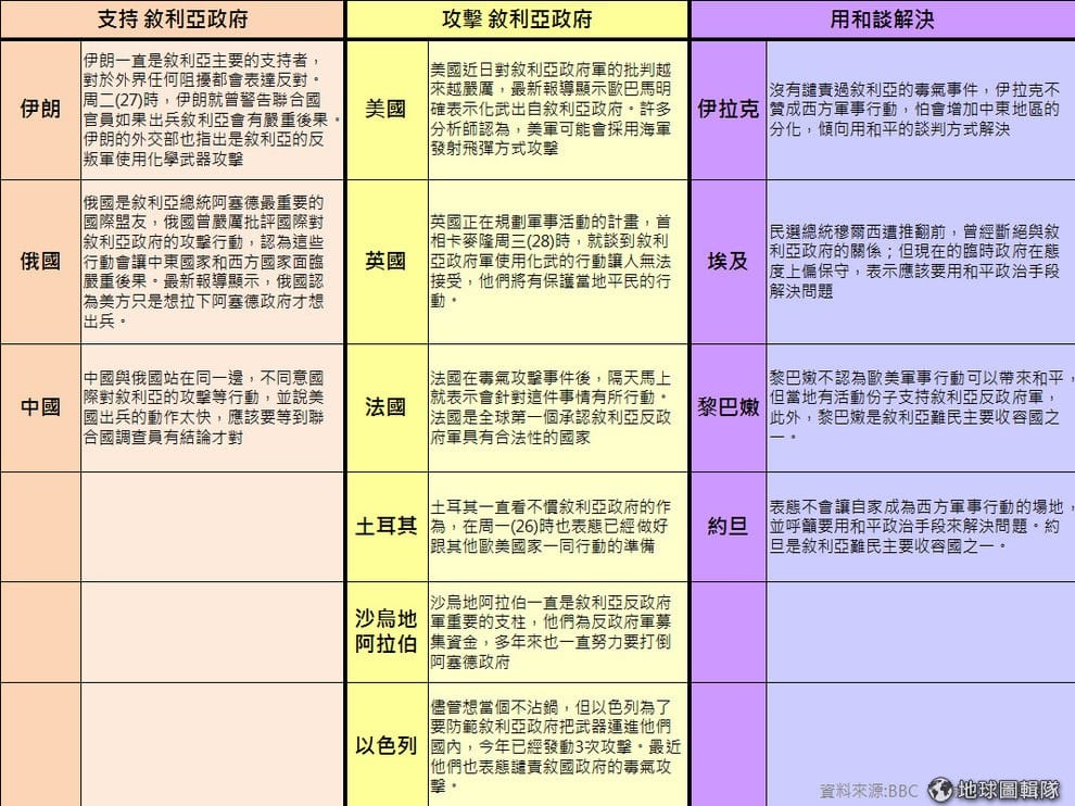 各國對於敘利亞政府的態度不一,以地圖方式來看,紫色標記點代表不支持武力攻擊,但沒有特別表態支持哪一方。黃色標記點表示贊成對敘利亞政府進行武力行動。紅色標記點代表與敘利亞政府同陣線,不認同美國出兵。