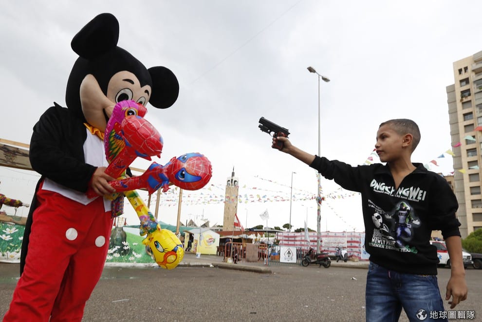 路透社一名敘利亞孩童拿著玩具槍指著米奇人偶。
