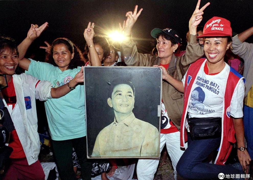 時至今日,菲律賓前總統馬可仕的支持者仍大力支持更改國名為「馬哈利卡」。圖為 1996年,菲律賓前總統馬可仕的支持者舉著他的照片,上街高喊「他是我們的英雄」。