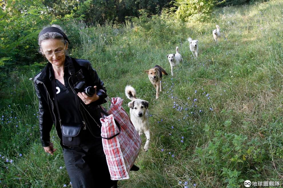2013年7月,在羅馬尼亞首都布加勒斯特(Bucharest),一名婦女在公園餵完流浪狗之後,在她的身後跟著一整排的狗。