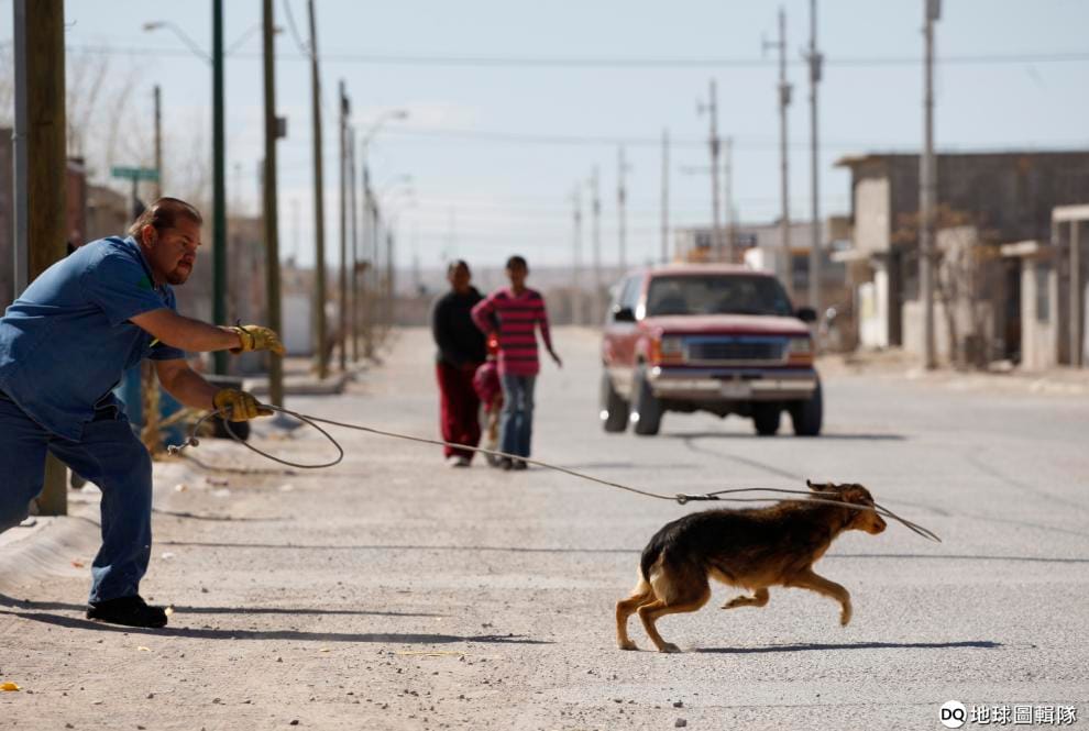 2013年2月,在墨西哥華瑞茲城(Ciudad Juarez),一名工作人員拋出套鎖,準備將街道上的流浪狗們一網打盡。