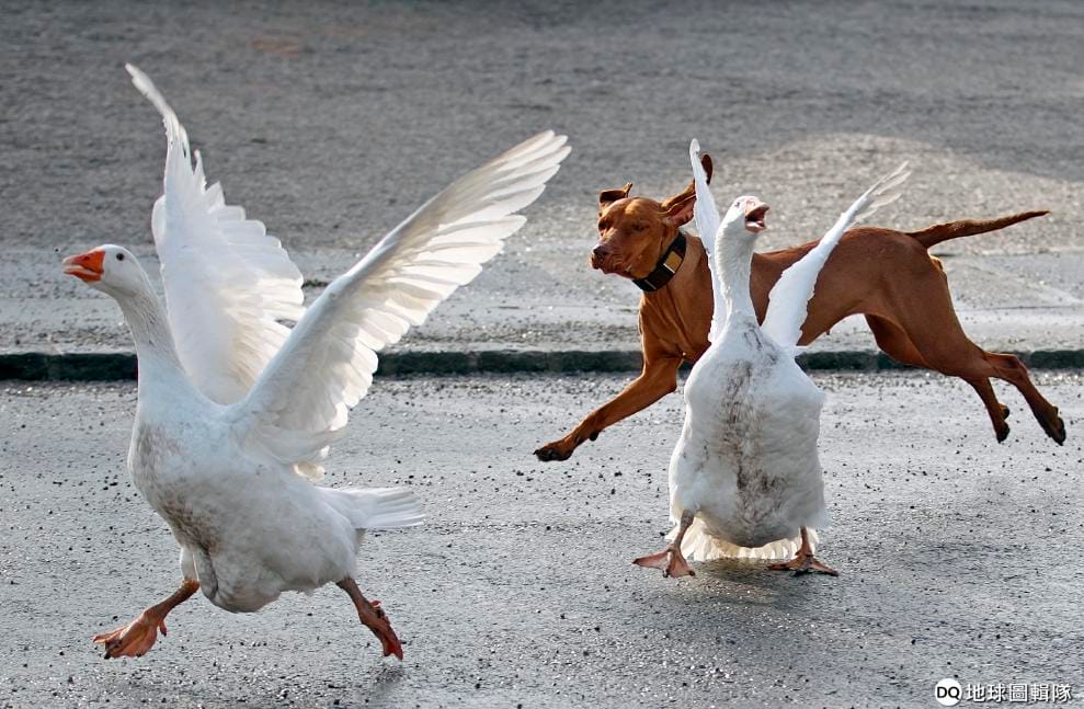 2013年1月,在奧地利維也納(Vienna),一隻流浪狗追著兩隻鵝跑。