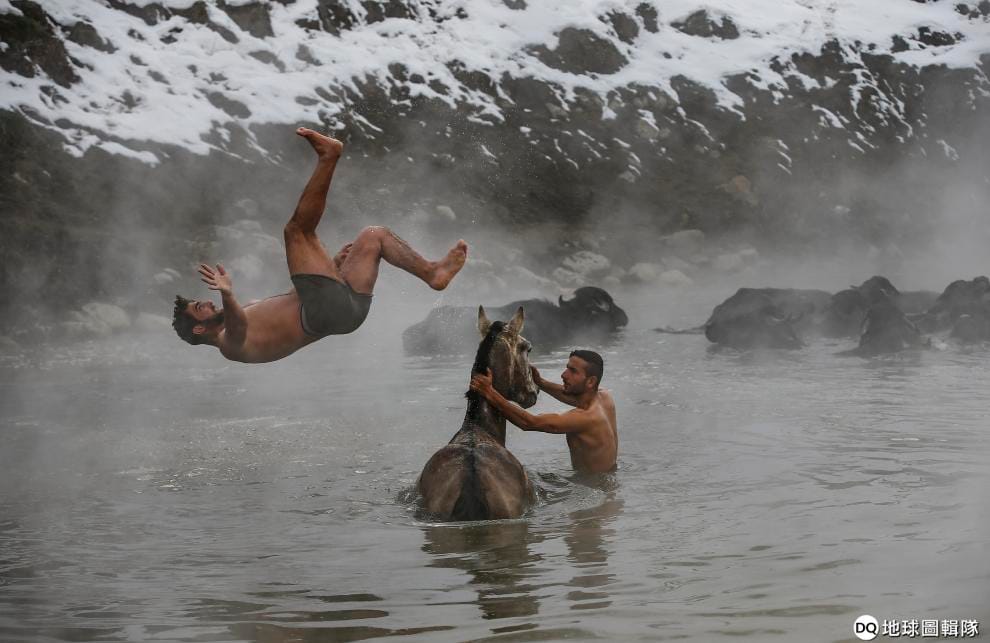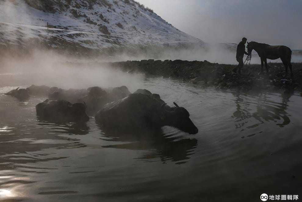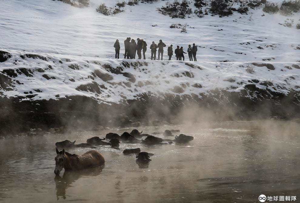 事實上,水牛們早就熟門熟路,等著泡在熱氣蒸騰、攝氏 40度的溫泉裡暖和一下,牧牛人要把牠們趕出溫泉還得花上好一番工夫,才能讓對溫泉戀戀不捨的水牛回家。