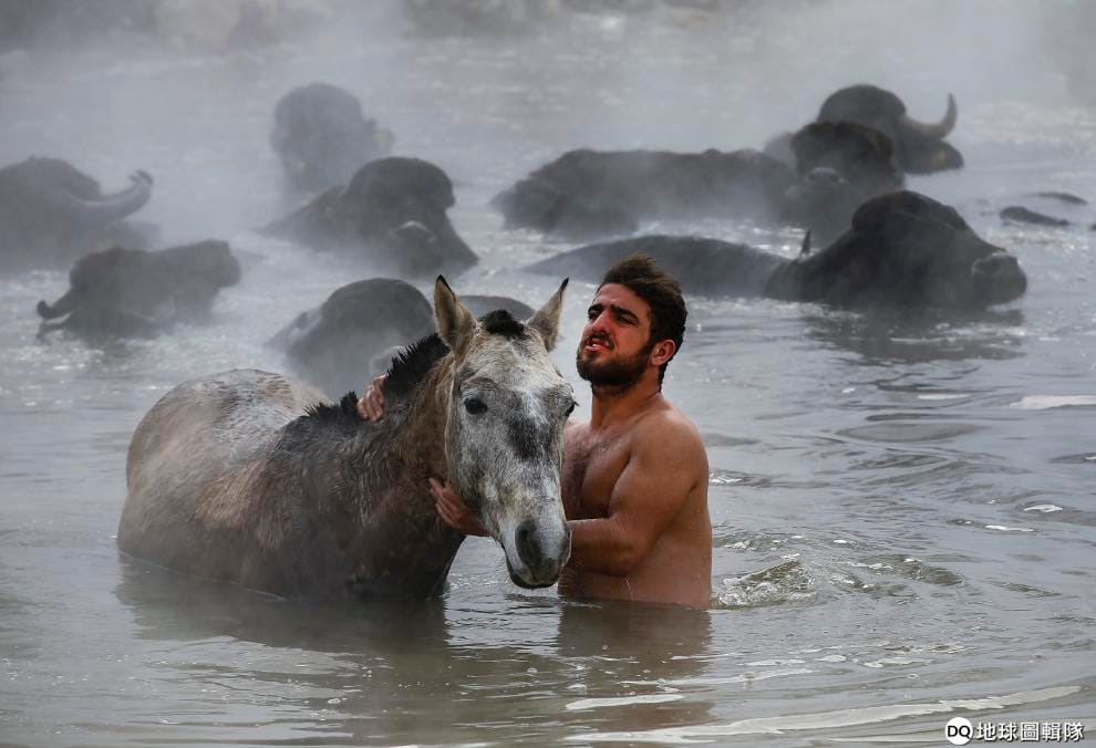 美聯社 / 達志影像趁著水牛在乖乖泡湯的同時,牧牛人穆罕默德朵倫也會趕快幫馬洗個澡。