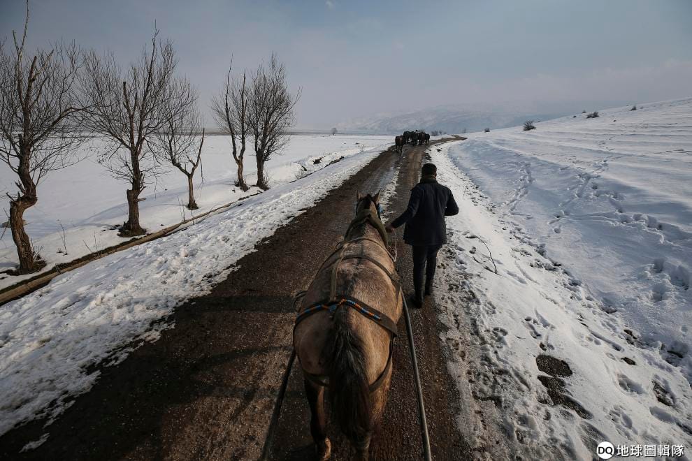 美聯社 / 達志影像土耳其牧牛人穆罕默德朵倫趕著水牛前往溫泉。朵倫一家有 9個兄弟姊妹,其中,穆罕默德唸到中學就回家幫忙家計。