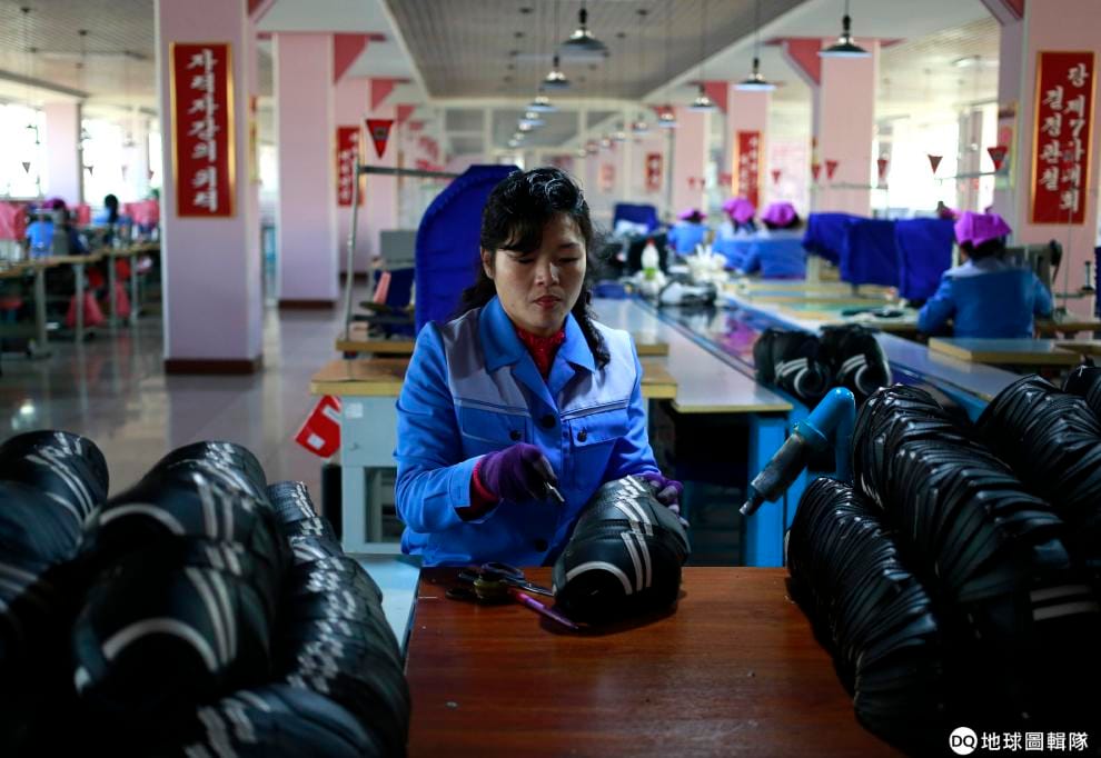 在北韓柳垣鞋子工廠內,工作人員正在製作一雙雙運動鞋,北韓領導人金正恩要他們仔細研究來自全世界的鞋子。