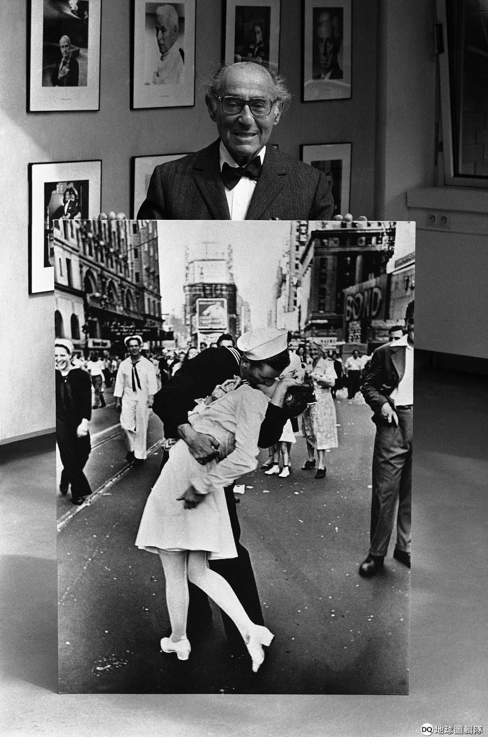 Newscom / 達志影像德裔美籍攝影師艾森施泰特扶著自己的經典之作《勝利之吻》,這張照片成了 20世紀最出名的照片之一。