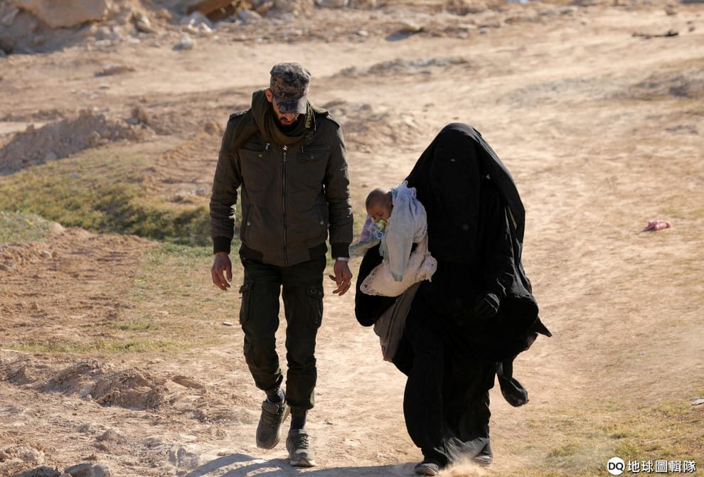 2019年2月,在敘利亞德爾祖爾省(Deir Al Zor province)巴古斯村附近,一名女子抱著她的嬰兒在路上走著。