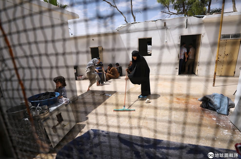 圖為 2017年6月,在敘利亞安伊薩(Ain Issa)難民營,曾為伊斯蘭國戰士之妻的突尼西亞人歐希曼(Iman Othman),在營區裡打掃地板。
