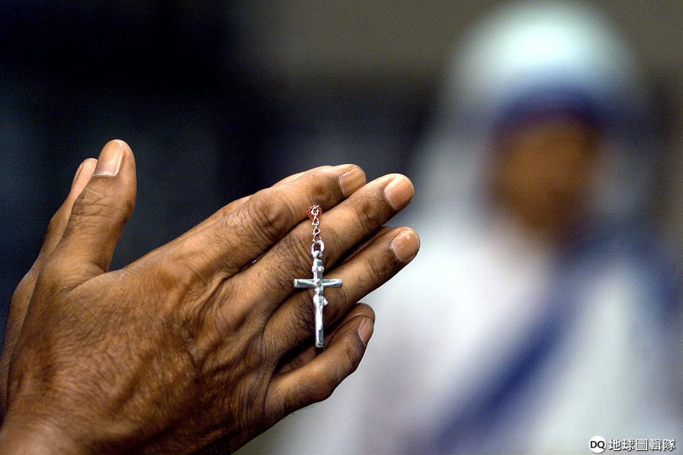 圖為 2003年10月,在印度加爾各答的仁愛傳教會(Missionaries of Charity),一名教徒在德蕾莎修女(Mather Teresa)的墓旁邊握著十字架禱告。