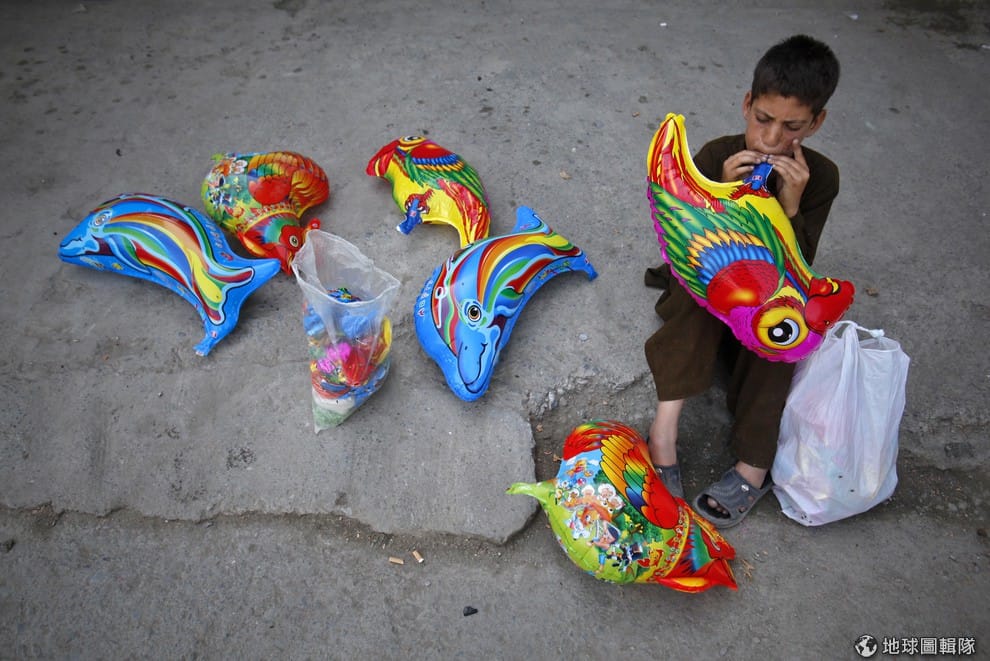 12歲的阿沙德(Arshad)吹飽一個個彩色氣球,準備待會賣給客人。