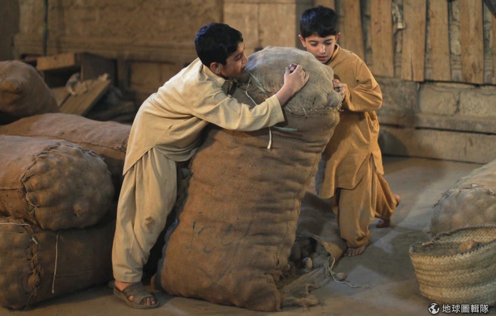 2個巴基斯坦小男孩一起搬運沉重的馬鈴薯袋。