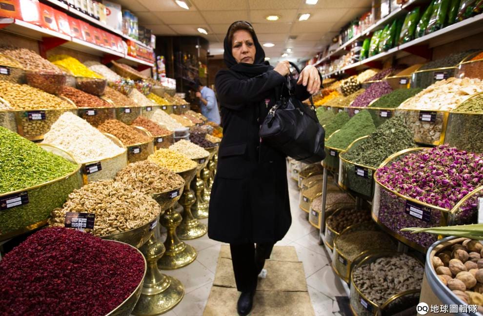 在德黑蘭市集內的一間乾貨店,一名女子準備回家。目前,在台灣可以看到來自伊朗的椰棗,台灣和伊朗也一直保持著經貿交流。