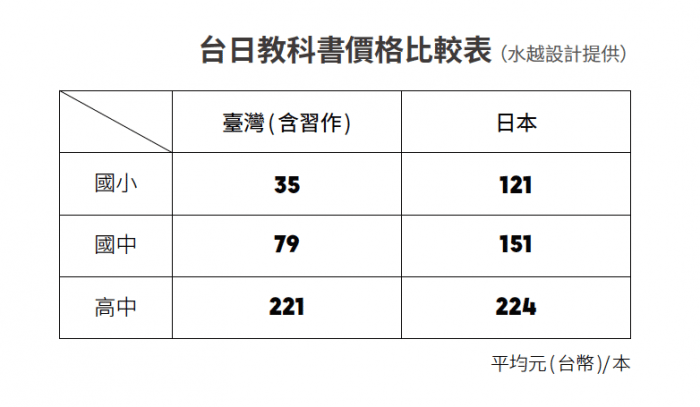 日本國中以下的教科書費用皆由政府負擔。然而若我們將台日教科書做對比,日本國小教科書的售價是台灣的三倍以上,可見日本政府在保障教育普及化上不遺餘力。
