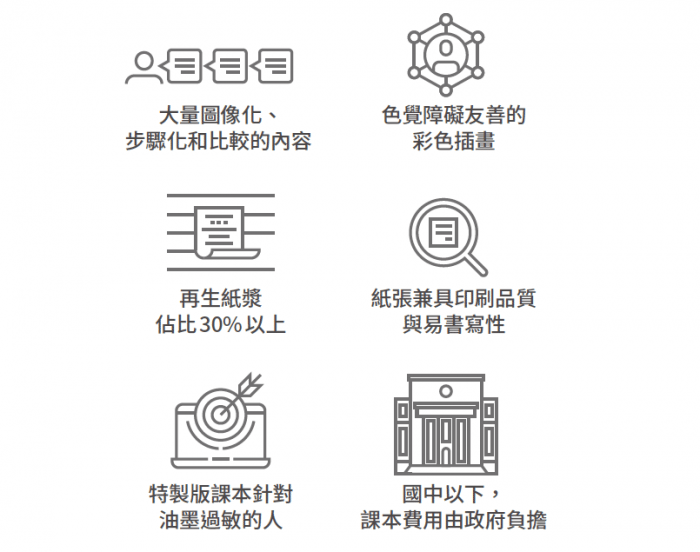 日本的小學課本除了精美的外表,其中也包含了許多非常貼心的設計,課文內容大量應用圖像化、步驟化、和比較的方法,讓知識都在清晰的邏輯中呈現,學生也能一目了然。課本也非常體貼不同學生的需求,例如課本內的插圖,一律都使用能讓有色覺障礙的學生也能清楚辨識的配色;對於油墨過敏的學生,也會提供如日曬本、影印本、或特別消味本等客製版本。