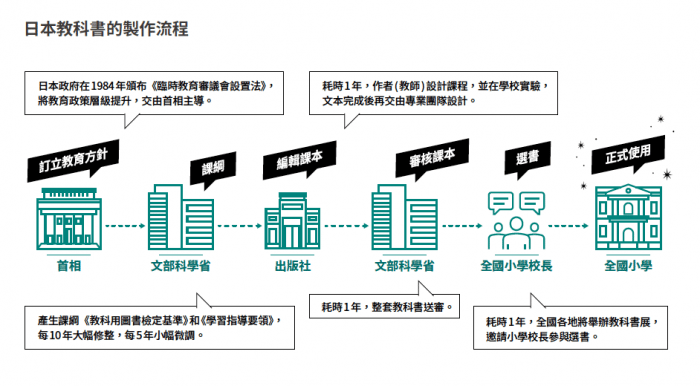 現今日本教科書的製作流程,可以追溯至1984年。水越設計的企劃長林舒表示,日本在1980年時經濟起飛、媒體興盛,卻導致國人對於學校教育的重視程度降低,故政府下定決心改革,將教育政策的制定提升至最高層次,由首相主導教育改革。