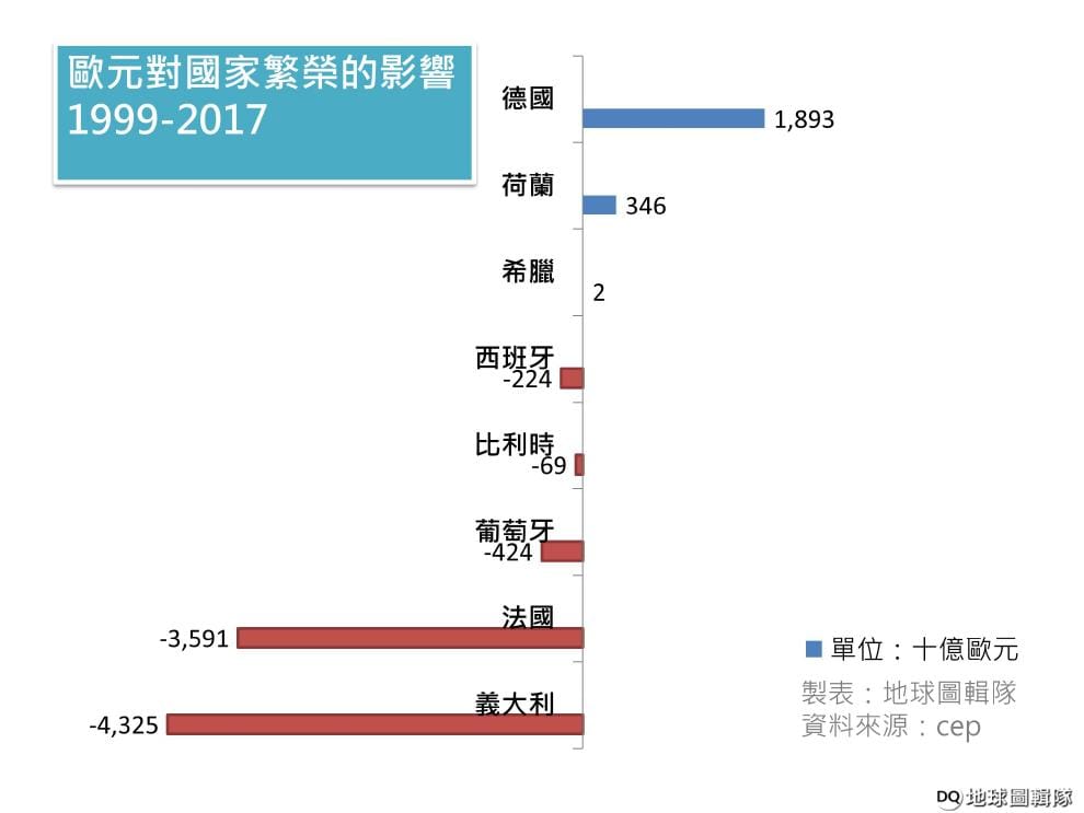 上表為 1999-2017年間歐元對國家繁榮的影響。加入歐元區受惠最多的是德國和荷蘭,損失最多的則是法國和義大利。