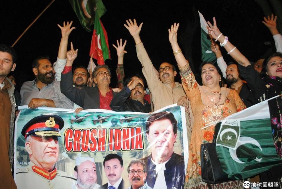 路透社 / 達志影像26號晚間在巴基斯坦,民眾手持海報上街抗議印度發動空襲,海報上印著「摧毀印度」。