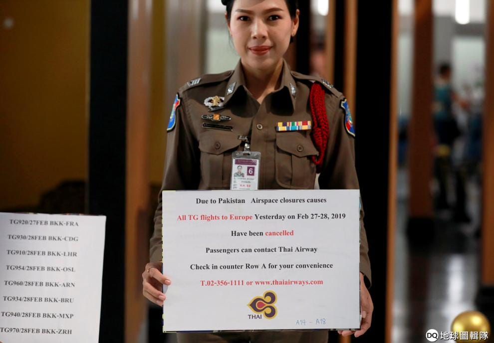 2月28日,在位於曼谷的蘇凡納布國際機場,一名泰國警察拿著告示牌,提醒民眾由於巴基斯坦關閉領空的緣故,所有飛往歐洲的班機都將取消。