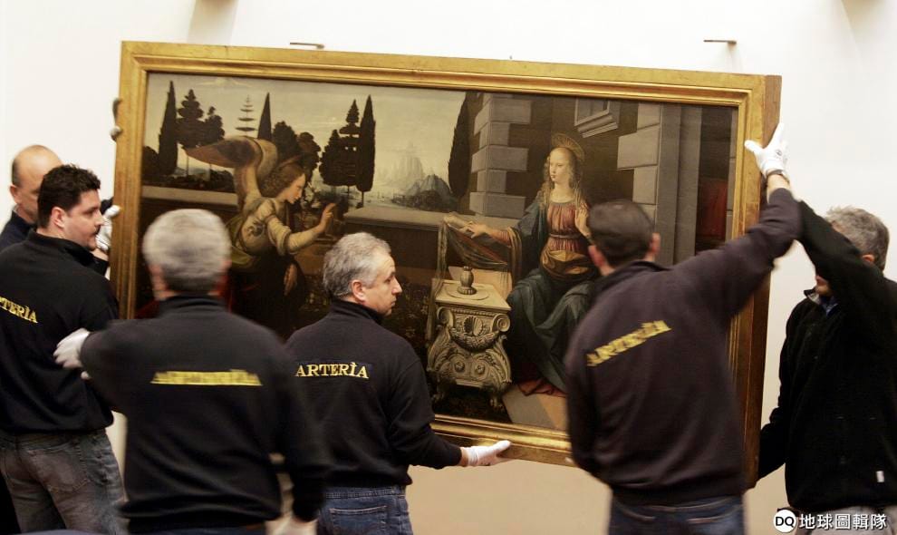 2007年3月,日本向義大利烏菲茲美術館提借了達文西的著名畫作《聖母領報》,畫面中人們正小心地把畫作給拿下來。