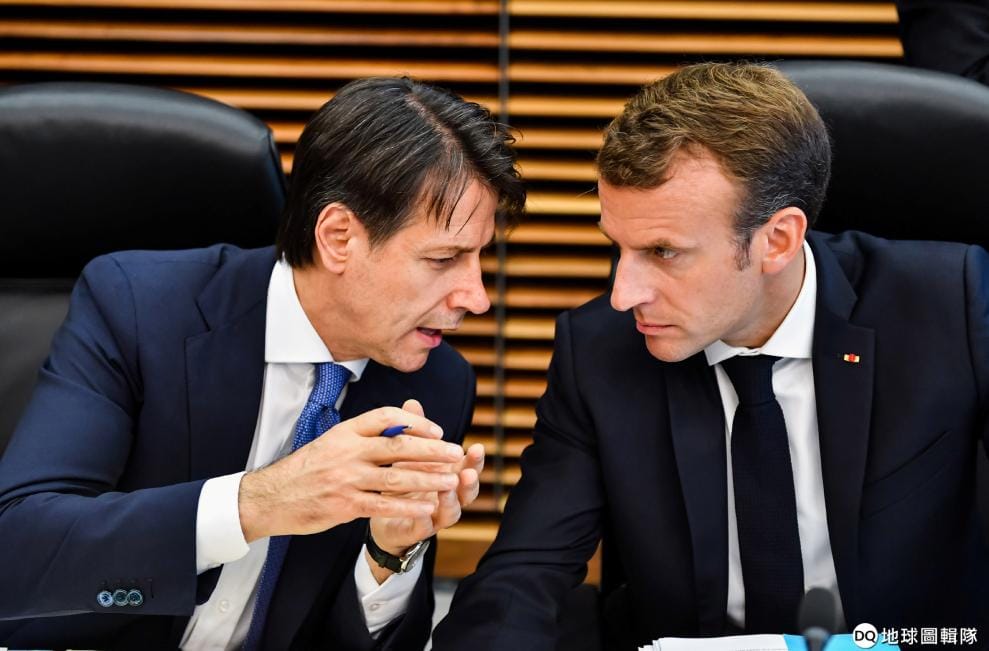在 2018年6月的歐盟高峰會上,義大利總理孔蒂(Giuseppe Conte,左)和法國總統馬克宏(右)正在低聲交談。