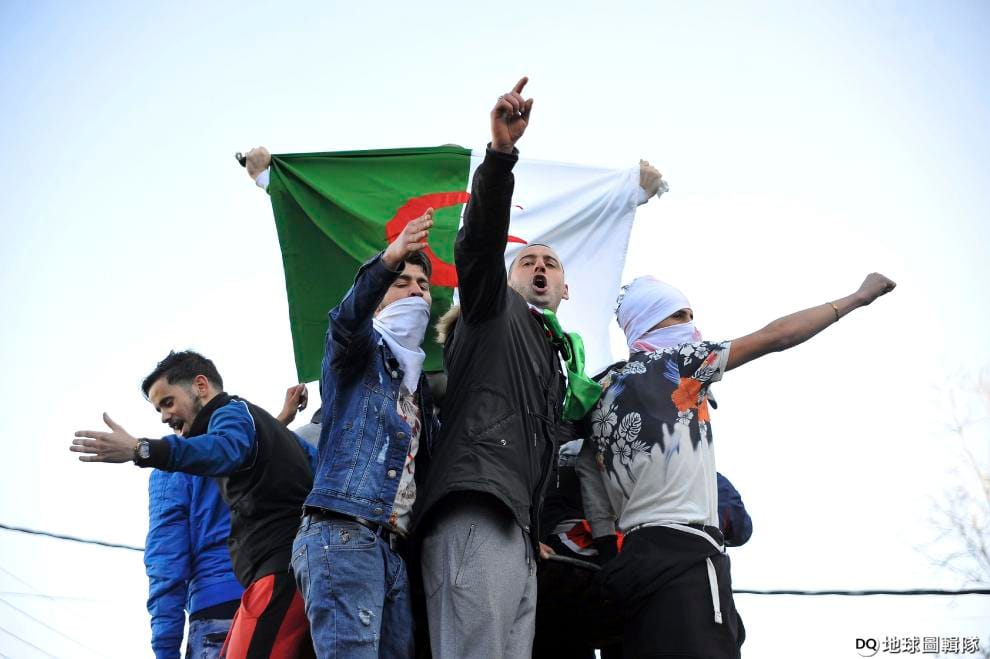 11號晚間,在阿爾及利亞總統包特夫里卡宣布退選後,民眾開心地舉著阿爾及利亞國旗上街慶祝。(03/12新增)