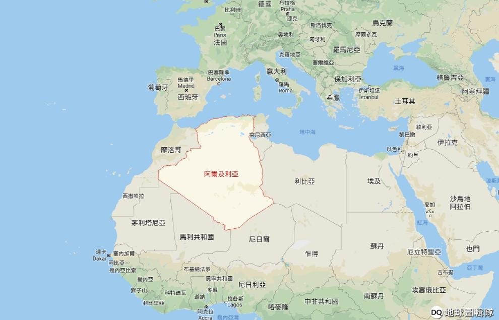 圖中紅色框線處就是阿爾及利亞。阿爾及利亞在 1962年脫離法國殖民獨立,國土面積居全非之冠。