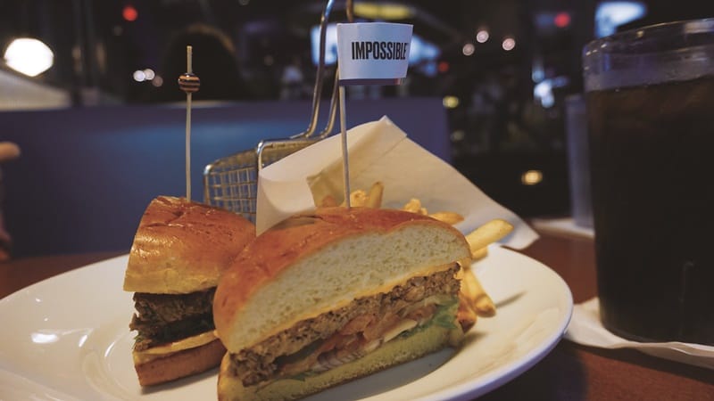 這款由小麥、馬鈴薯、椰子油製成的漢堡排,含有大豆提煉的「血紅素」(heme),吃在嘴裡多了一股幾可亂真的肉味,堪稱「高科技素肉」。