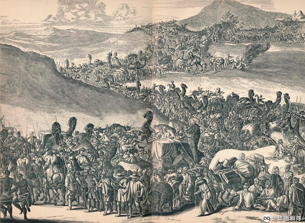 圖為穆薩國王帶著 6萬人車隊前往麥加朝聖的畫面,當時他們在沙漠中就像一座移動城市。